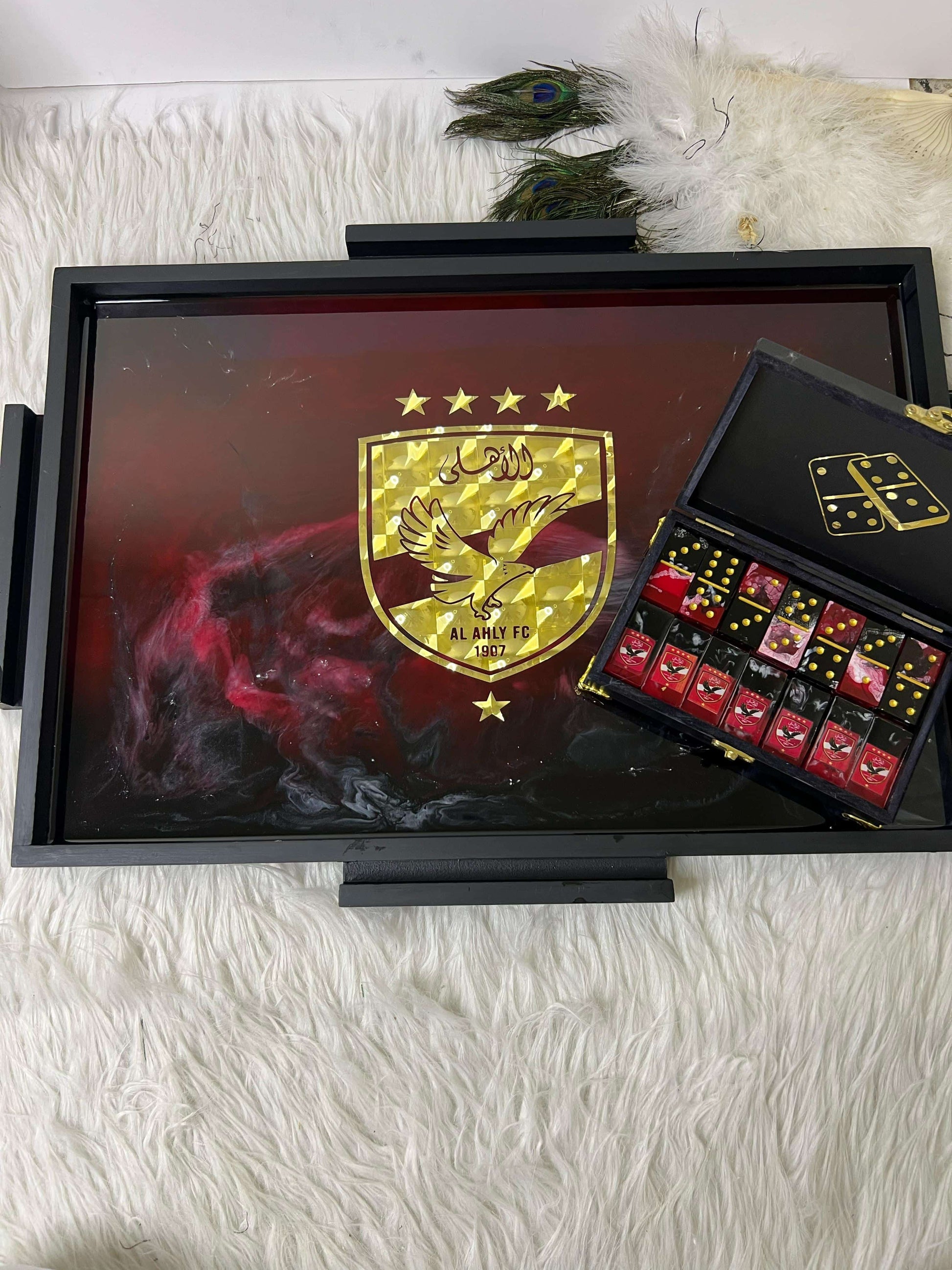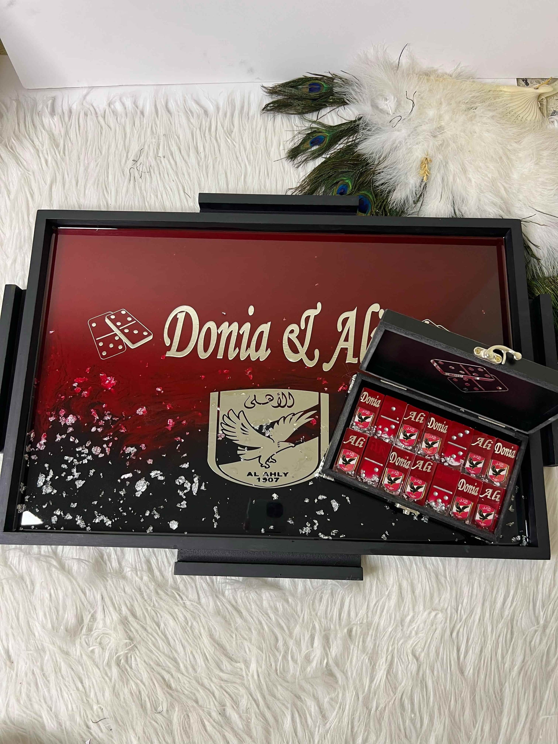 A handcrafted domino set with a matching board—made to play beautifully and look even better on display.